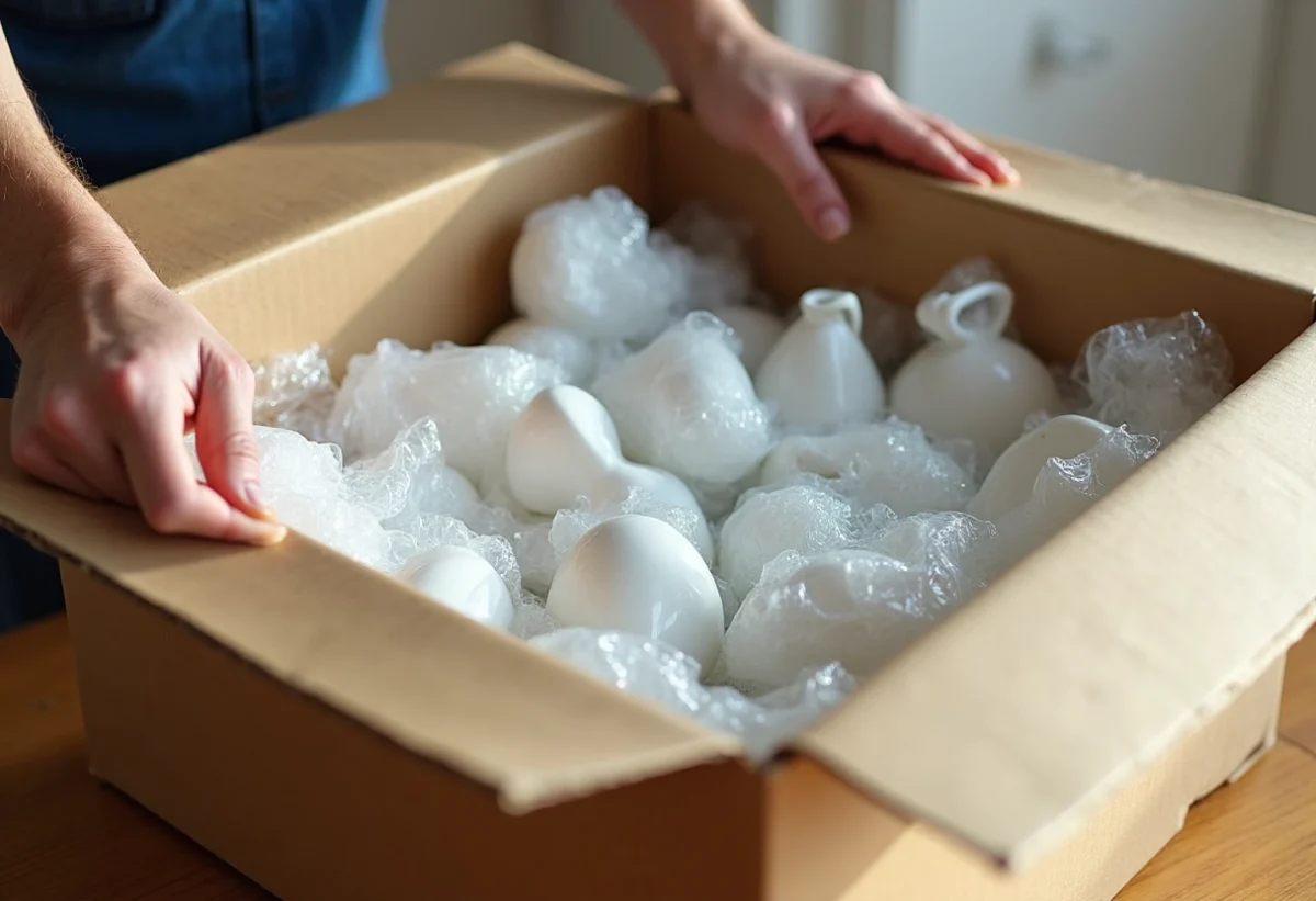 Emballez chaque article dans du papier bulle, en doublant les couches sur les zones les plus exposées. Sécurisez avec du ruban adhésif pour empêcher tout glissement. Placez l’objet ainsi protégé dans une boîte dont les dimensions laissent au moins cinq centimètres de marge sur tous les côtés, marge que vous comblerez de papier froissé ou de coussins d’air pour absorber les vibrations du transport.